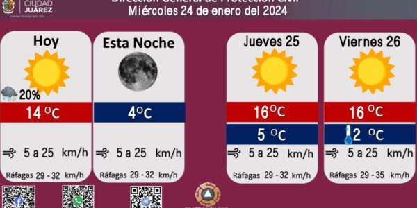 Juárez. – La Dirección General de Protección Civil, con base en informes del Servicio Meteorológico Nacional, pronostica un jueves mayormente soleado con una temperatura máxima de 16 grados Celsius, mientras que la mínima será de 6 °C para esta noche….