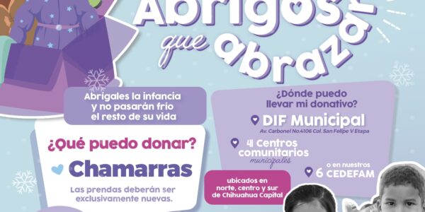 Chihuahua, Chih., El Gobierno Municipal, informa que continúa la campaña “Abrigos que Abrazan”, iniciativa de la presidenta del DIF Municipal, Karina Olivas, que desde su creación en 2021, recolecta chamarras para proteger del frío a niñas, niños y adolescentes (NNA)…