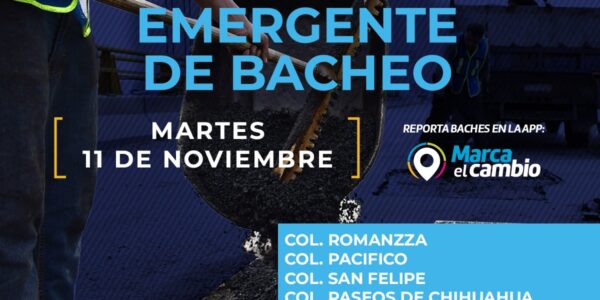 Ciudad de Chihuahua, Chih., El Gobierno Municipal, a través de la Dirección de Obras Públicas, realizará trabajos de bacheo este 11 de noviembre, mediante el programa emergente en calles de las colonias: Romanzza, Pacifico, San Felipe y Paseos de Chihuahua….