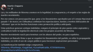 A través de sus redes sociales, Chaparro Payán —quien recientemente fue respaldado por grupos militantes como aspirante a la gubernatura de Chihuahua— expresó su preocupación por el incumplimiento de los lineamientos aprobados por el Consejo Nacional de Morena el pasado 7 de marzo.