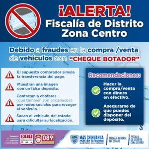 Chihuahua, Chih., La Fiscalía de Distrito Zona Centro emitió una advertencia por el incremento de fraudes cometidos mediante el uso del llamado cheque botador, una modalidad que afecta principalmente a personas que buscan comprar o vender vehículos. De acuerdo con la Coordinadora de la Unidad Especializada en Investigación de Delitos Patrimoniales, Miriam Janeth Tarango García, durante 2025 se han registrado más de cien querellas relacionadas con este esquema.