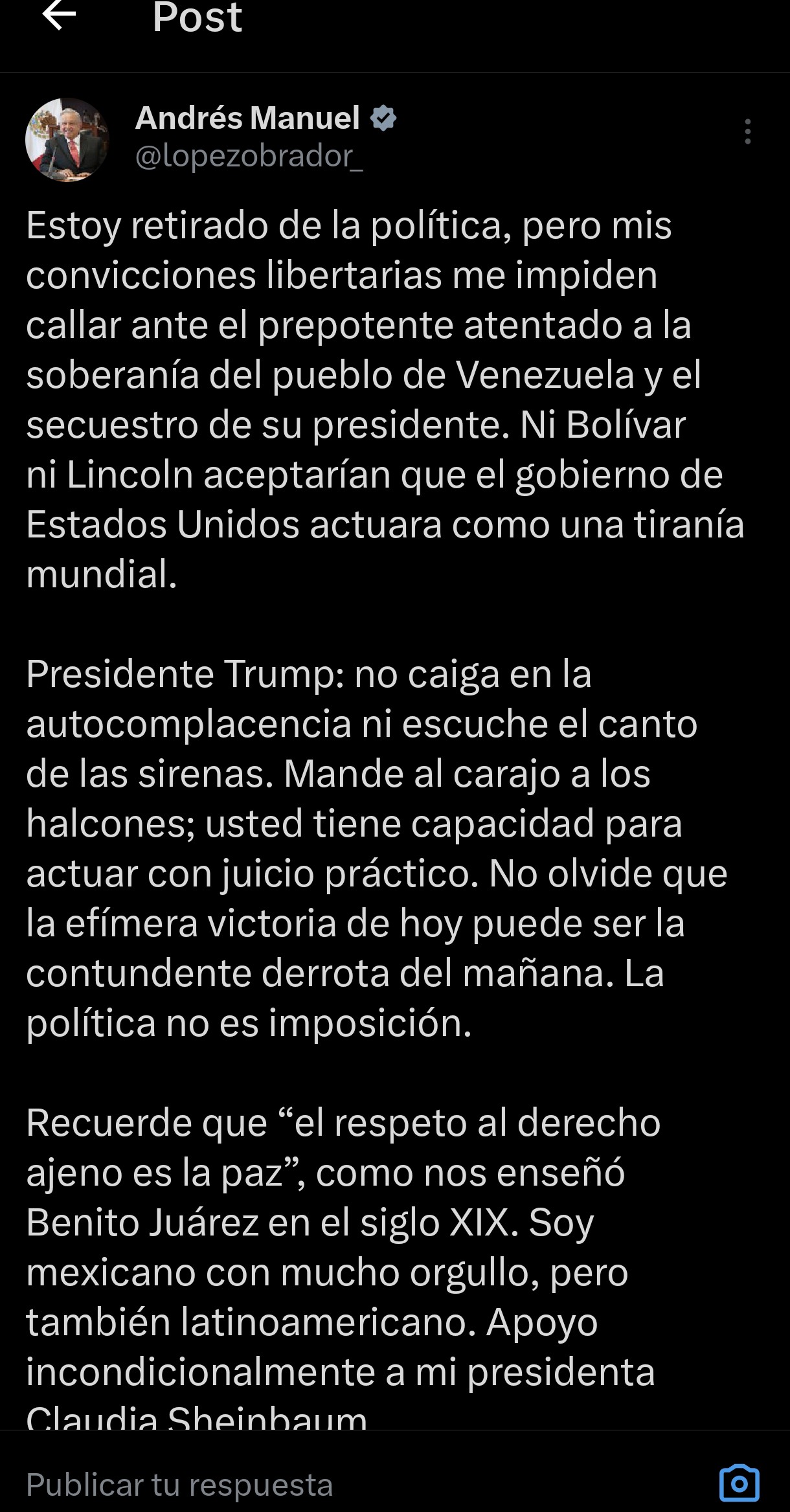En su declaración, AMLO comparó la situación con principios históricos defendidos por figuras como Simón Bolívar y Abraham Lincoln, señalando que ninguno habría aceptado que Estados Unidos actuara como una “tiranía mundial”. El exmandatario advirtió que la política exterior no debe basarse en la imposición ni en la prepotencia, y llamó a actuar con prudencia y juicio práctico.