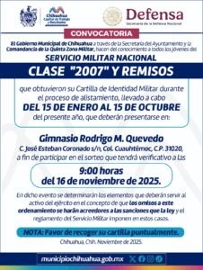 Ciudad de Chihuahua, Chih., El Gobierno Municipal de Chihuahua, a través de la Junta Municipal de Reclutamiento, adscrita a la Secretaría del Ayuntamiento, informa que el próximo domingo 16 de noviembre se llevará a cabo el sorteo del Servicio Militar Nacional (SMN), correspondiente a la clase 2007 y remisos, en las instalaciones del Gimnasio Rodrigo M. Quevedo.