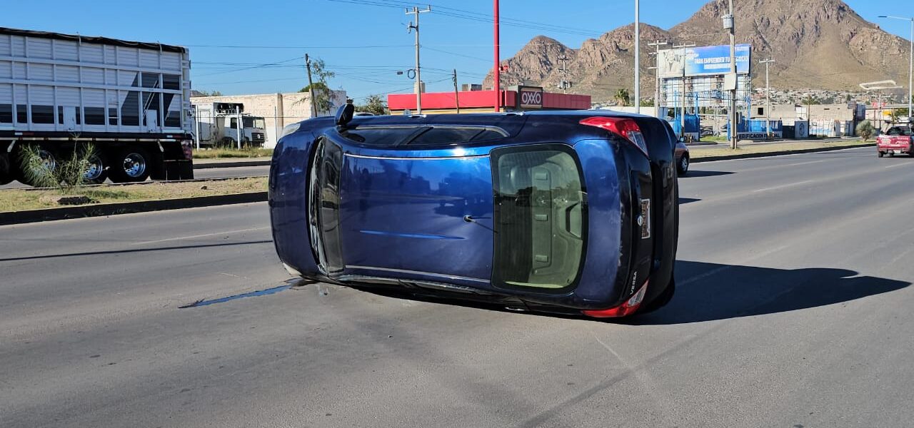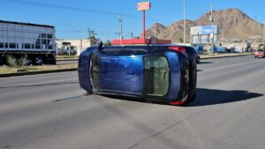 Chihuahua, Chih., Un fuerte accidente ocurrió sobre el periférico R. Almada, en el cruce con la calle Ninja de la colonia Villa Juárez, donde un tráiler y un vehículo Nissan Versa protagonizaron un choque que terminó con la volcadura del auto compacto. A pesar de lo aparatoso del percance, no se reportaron personas lesionadas.