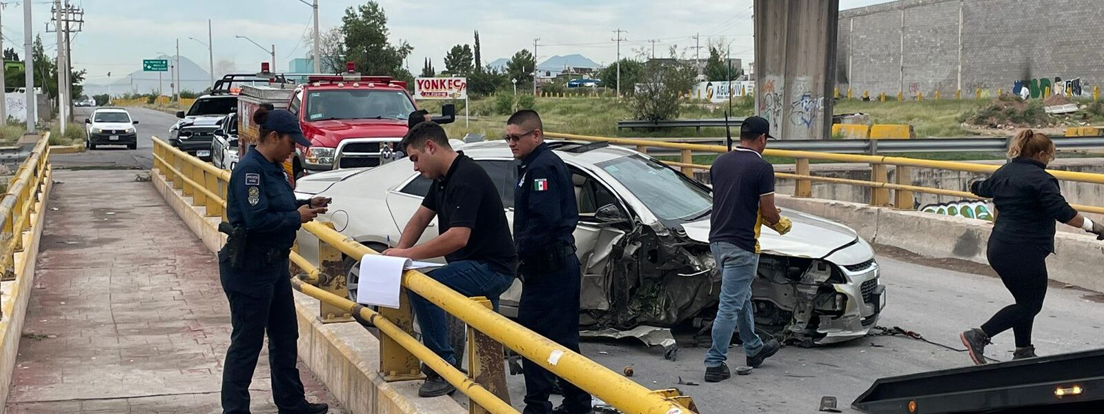 Chihuahua.– La mañana de este jueves se registró un fuerte accidente en el cruce de la avenida Venceremos y Vialidad Nogales, donde un vehículo Chevrolet Malibú, en el que viajaban dos mujeres jóvenes, impactó contra la valla de acero del puente ubicado bajo los puentes paralelos de la Nogales.