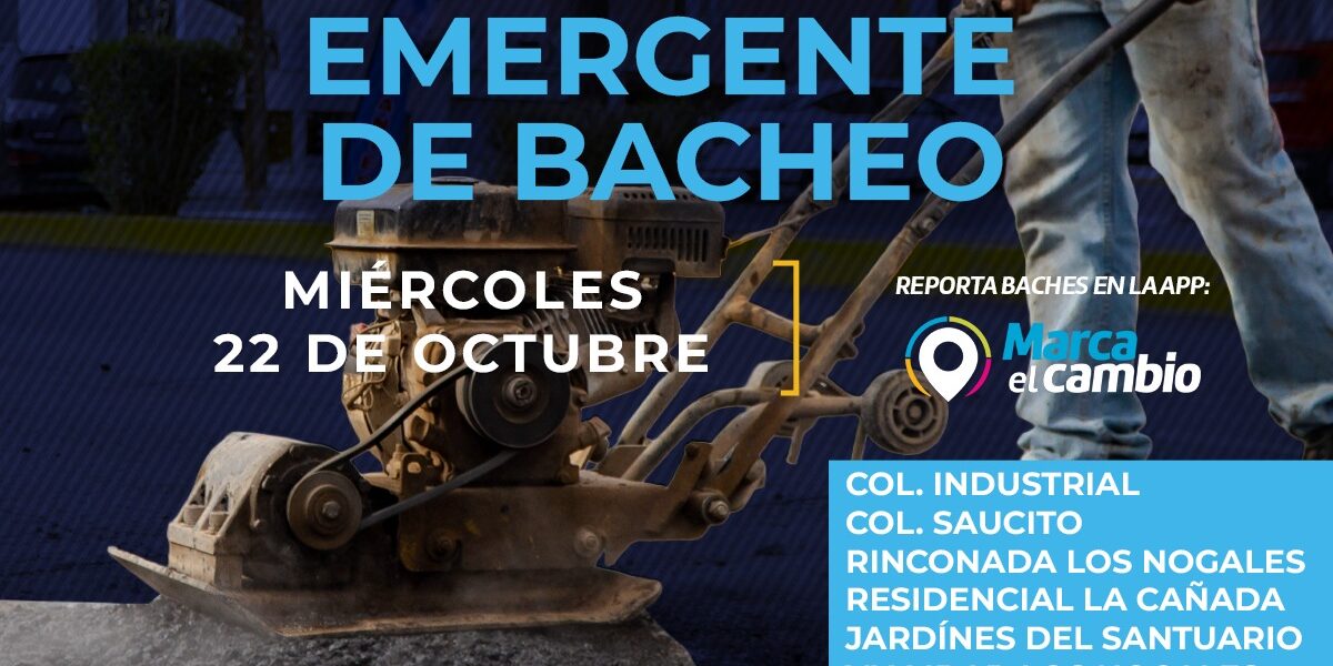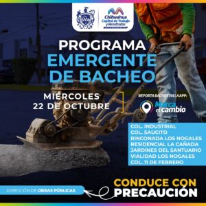 Ciudad de Chihuahua, Chih., El Gobierno Municipal, a través de la Dirección de Obras Públicas, bacheará este 22 de octubre, mediante el programa emergente, en calles de las colonias Industrial, Saucito, Rinconada Los Nogales, Residencial La Cañada, Jardines del Santuario, Vialidad Los Nogales y 11 de Febrero.