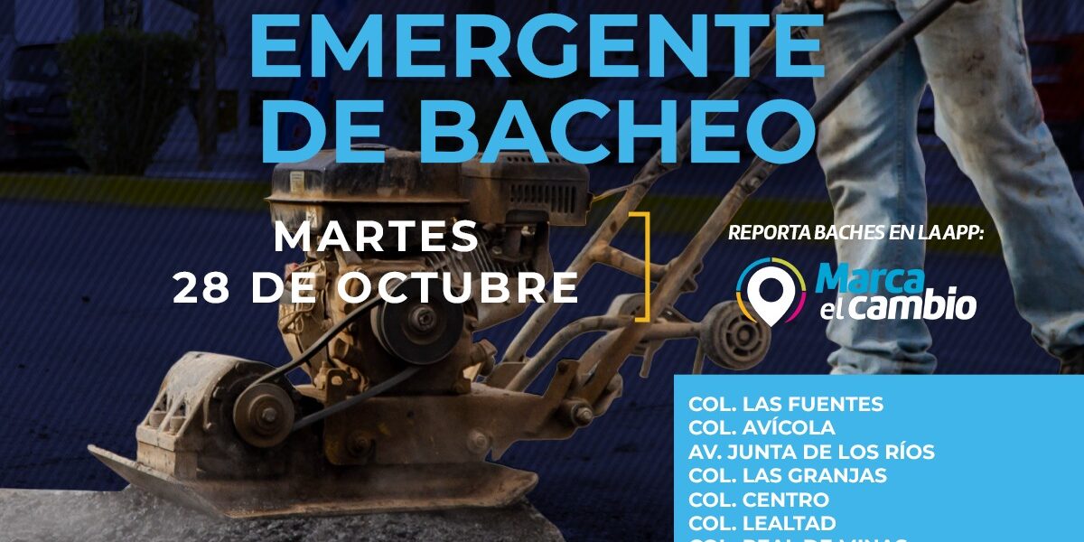 Ciudad de Chihuahua, Chih., El Gobierno Municipal, a través de la Dirección de Obras Públicas, bacheará este 28 de octubre, mediante el programa emergente, en calles de las colonias Las Fuentes, Avícola, Las Granjas, Centro, Lealtad, Real de Minas, Minerales y en la avenida Junta de los Ríos.