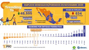Chihuahua, Chih., Durante noviembre de 2025 el país registró la creación de 48 mil 595 empleos formales que elevaron el total nacional a más de 22.8 millones de puestos de trabajo. Esta cifra representa el nivel más alto de empleo formal desde que se tiene registro y marca un cierre de año favorable en términos generales para el mercado laboral mexicano.