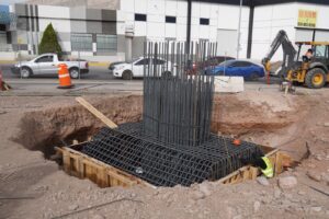 Los trabajos avanzan en tiempo y forma con la reubicación de líneas de alcantarillado y de conducción de agua potable. De igual manera, continúan las excavaciones para el desplante de zapatas, así como el habilitado y la colocación de acero para columnas y el vaciado de concreto en dados.
