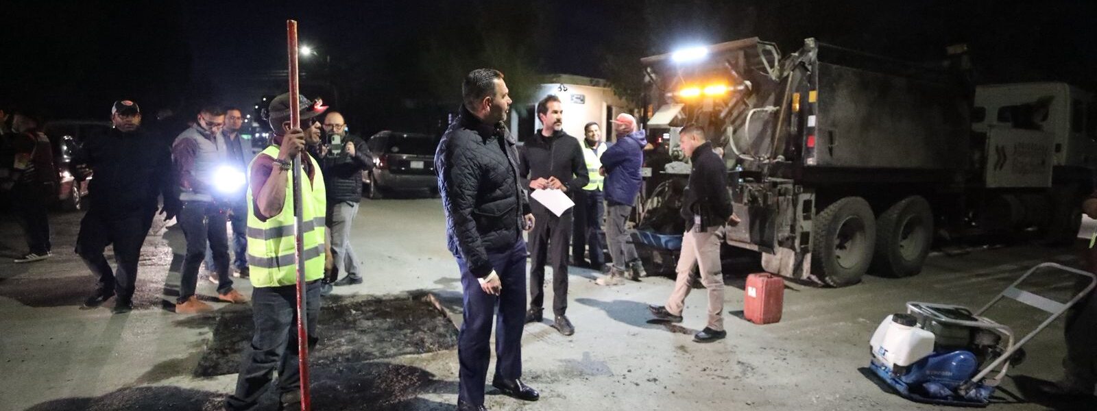 Ciudad Juárez, Chih., El presidente municipal Cruz Pérez Cuéllar realizó una supervisión nocturna de los trabajos de bacheo que se llevan a cabo en la calle Venezuela y Aguilar Sáenz, ubicadas en la colonia Melchor Ocampo, como parte del programa intensivo de rehabilitación vial que mantiene activo el Gobierno Municipal.