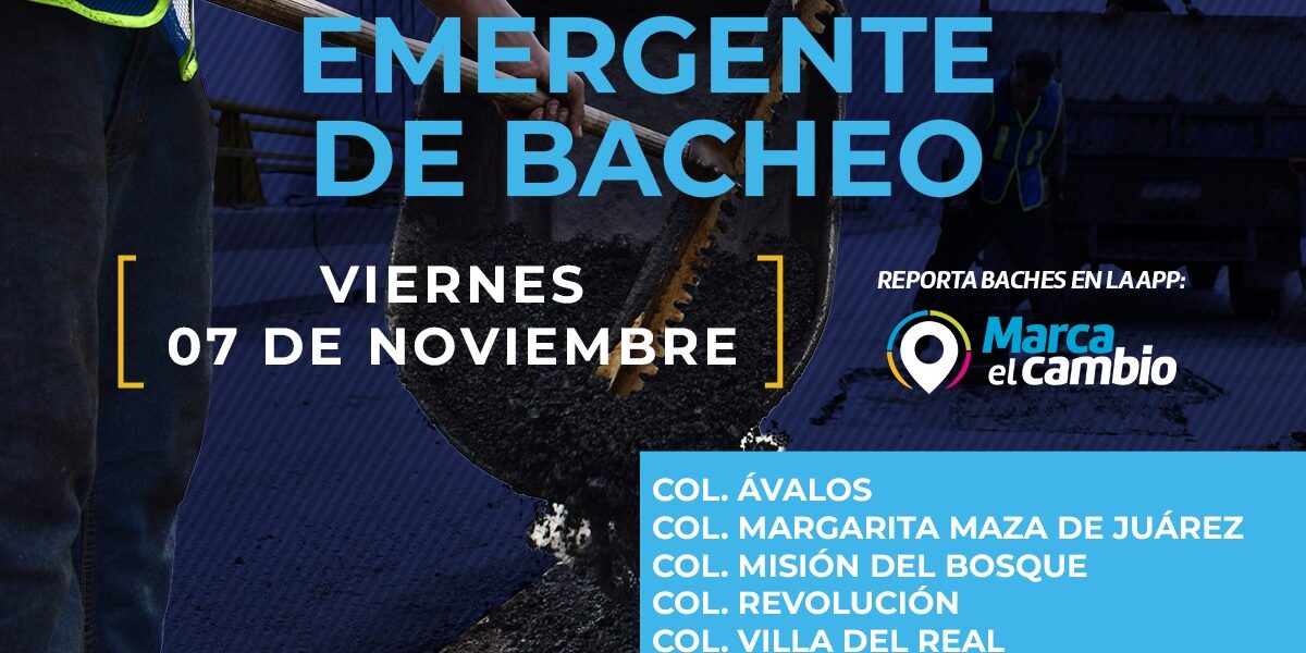 Ciudad de Chihuahua, Chih., El Gobierno Municipal, a través de la Dirección de Obras Públicas, realizará trabajos de bacheo este 7 de noviembre, mediante el programa emergente, en calles de las colonias: Ávalos, Margarita Maza de Juárez, Misión del Bosque, Revolución, Villa del Real y Villa Dorada.