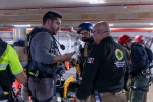 También se abordaron temas de coordinación de brigadas bajo el Sistema de Comando de Incidentes, manejo de equipo de respiración autónoma y monitoreo de ambientes con baja concentración de oxígeno o presencia de gases tóxicos. Los participantes realizaron prácticas en escenarios simulados, incluyendo descensos controlados y maniobras en espacios reducidos que reflejaron condiciones reales de emergencia.