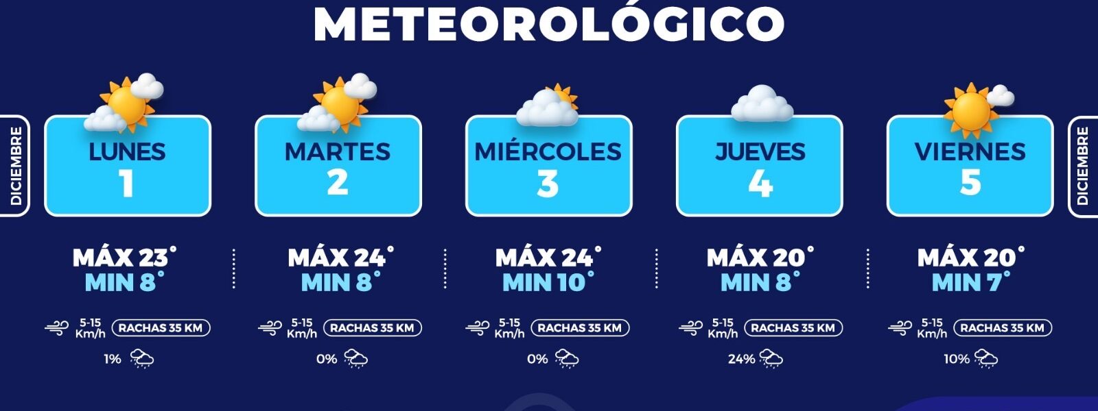 El martes 2 se mantendrán condiciones similares, con máxima de 24°C y mínima de 8°C. El miércoles 3 presentará cielo mayormente nublado y temperaturas que oscilarán entre 24°C de máxima y 10°C de mínima. El jueves 4 será el día con mayor posibilidad de lluvia, 24 por ciento, con un descenso en la máxima a 20°C y mínima de 8°C. Finalmente, el viernes 5 se pronostica cielo mayormente soleado, máxima de 20°C, mínima de 7°C y probabilidad de lluvia del 10 por ciento.
