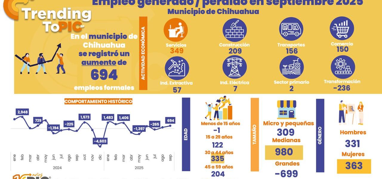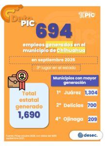 Al cierre de septiembre de 2025, Chihuahua se posicionó nuevamente como el municipio con mayor generación de empleos en el estado, acumulando 2,899 nuevas plazas durante los primeros nueve meses del año. Esta cifra supera a Delicias, que registró 2,665 empleos, Cuauhtémoc con 2,008 y Ciudad Juárez con 1,171, dentro de un total estatal de 6,316 empleos.