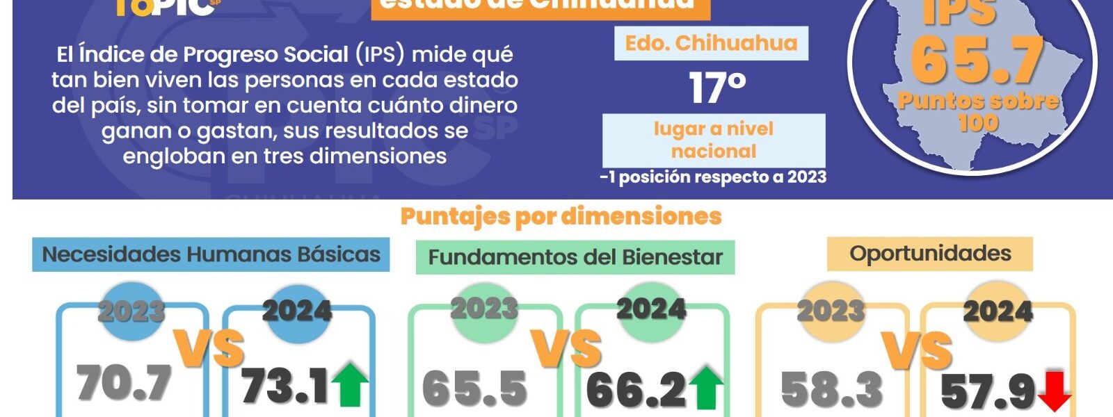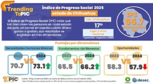 Chihuahua, Chih., Chihuahua alcanzó 65.7 puntos en el Índice de Progreso Social 2025, una cifra superior al resultado de 64.8 obtenido en 2023. Este avance refleja una mejora ligera pero constante en su desempeño general. El estado muestra resultados favorables en áreas como acceso al agua, vivienda y servicios básicos, lo que se mantiene como uno de sus principales puntos fuertes dentro de la evaluación.