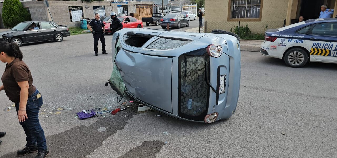 Chihuahua.- Un aparatoso choque con volcadura se registró en Chihuahua capital la tarde de este miércoles, sin que se reportaran personas lesionadas de gravedad. El percance involucró a un vehículo Buick Park Avenue de modelo atrasado y un automóvil Chevrolet Matiz.