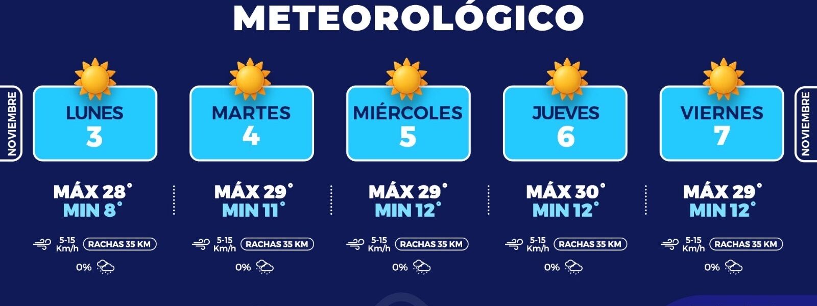 Para el miércoles 5, se prevén condiciones similares, con máxima de 29°C y mínima de 12°C, ambiente seco y sin precipitaciones. Asimismo, para el jueves 6 de noviembre continuará el clima estable y soleado, con una temperatura máxima de 30°C y mínima de 12°C; y finalmente, para el viernes 7, pronostican una máxima de 29°C y mínima de 12°.