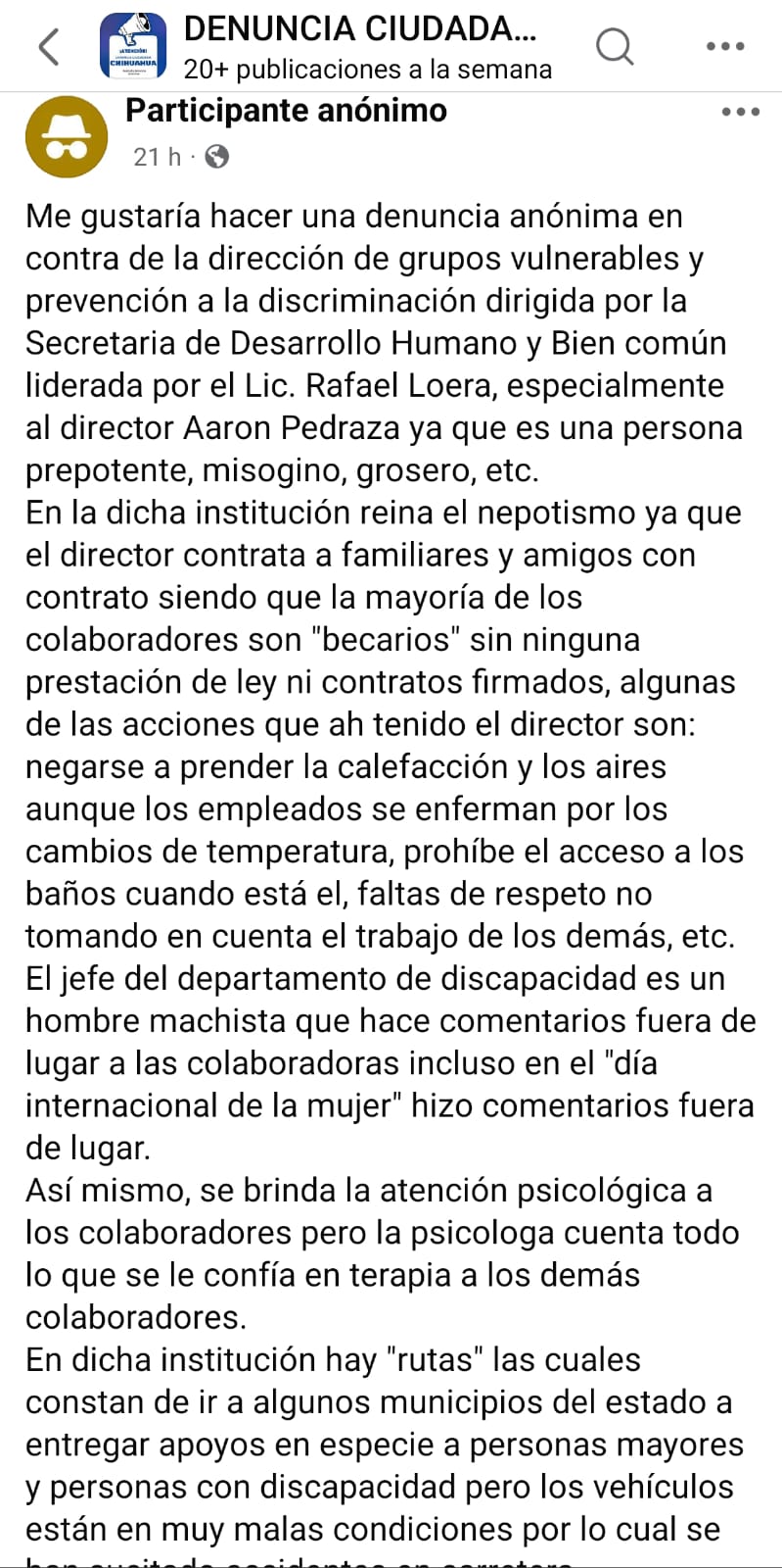 Chihuahua. – Una denuncia ciudadana señala presuntas irregularidades al interior de la Dirección de Grupos Vulnerables y Prevención a la Discriminación, dependiente de la Secretaría de Desarrollo Humano y Bien Común, encabezada por Rafael Loera. De acuerdo con el testimonio, el señalamiento apunta directamente contra el director Aaron Pedraza, a quien se le acusa de presunto trato prepotente, conductas misóginas y un ambiente laboral hostil dentro de la institución.