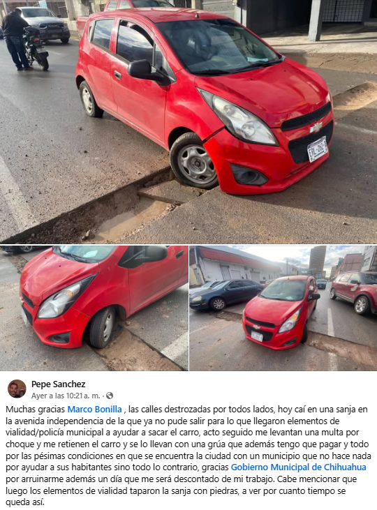 Chihuahua. – Una denuncia ciudadana publicada en redes sociales exhibió las malas condiciones de la avenida Independencia en Chihuahua capital y la actuación de elementos de la Policía Vial tras un accidente. Según el relato, una persona cayó con su vehículo en una zanja que no estaba señalizada, lo que derivó en daños y la necesidad de apoyo para sacar el carro.