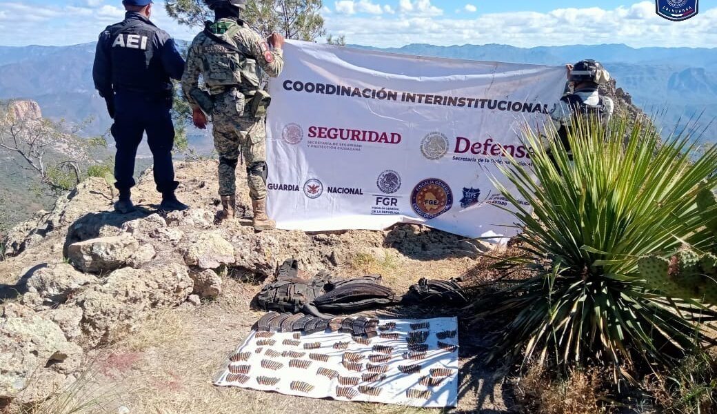 Cuauhtémoc, Chih., Elementos de la Agencia Estatal de Investigación que participan en las Bases de Operaciones Inter-Institucionales junto con elementos del Ejército y de la Guardia Nacional, destruyeron un campamento en el que aseguraron cartuchos y cargadores de armas de fuego y equipo táctico.