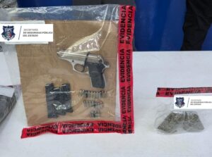 Posteriormente, durante labores de inteligencia realizadas el sábado, fue capturado Francisco Javier “N”, a quien se le decomisaron dos armas de fuego y cuatro envoltorios con 33 gramos de la misma sustancia vegetal. En una tercera intervención fue detenido David “N”, de 36 años, quien portaba un arma calibre .380 y 21 cartuchos útiles.