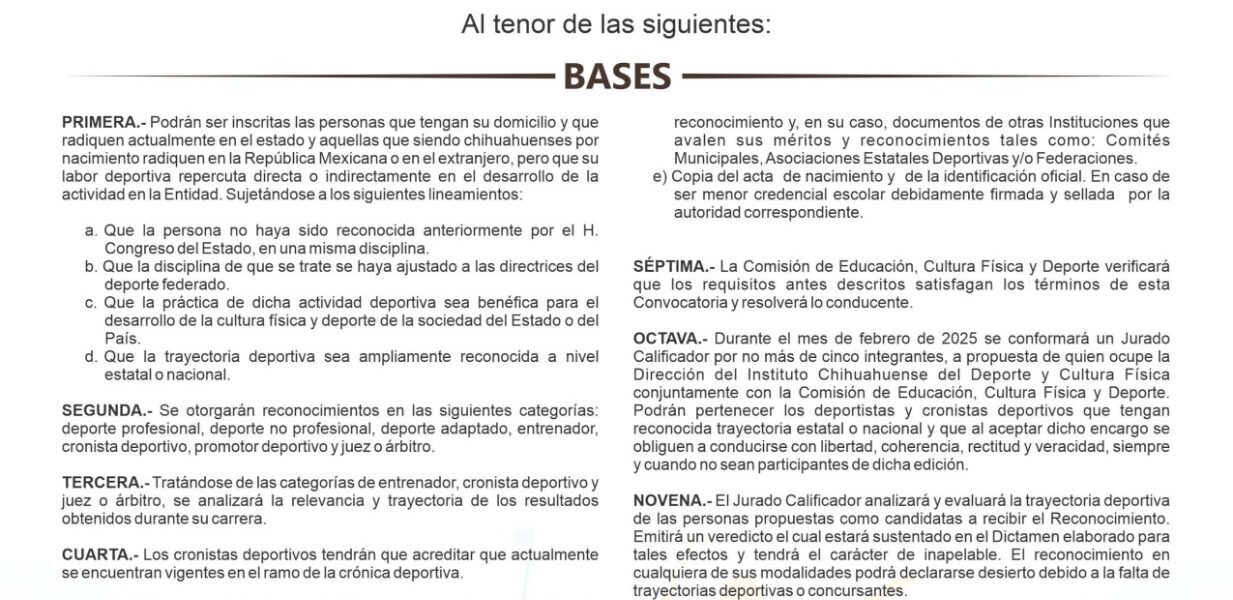 Es de destacar que, con esta convocatoria, se reconoce a las personas o equipos originarios o que radiquen en el Estado de Chihuahua, que con su labor deportiva hayan traído beneficios al Estado de Chihuahua o al País, es por ello y dado a la amplia trayectoria de quienes resultaron ganadores, que el Poder Legislativo otorgará en Sesión Solemne del próximo 18 de noviembre del año en curso, las placas conmemorativas y el incentivo económico por la cantidad de 30 mil pesos por categoría.