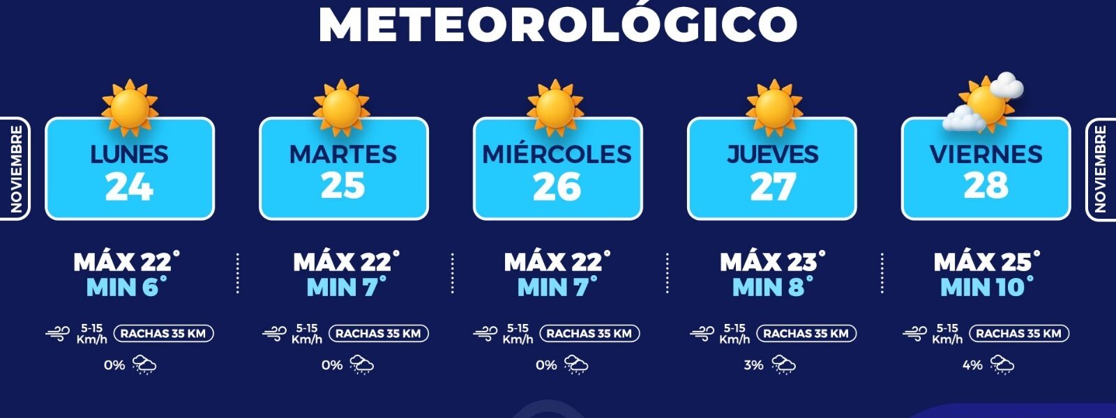 Para este lunes 24, se esperan condiciones soleadas, con una temperatura máxima de 22°C y una mínima de 6°C. Los vientos oscilarán entre 5 y 15 kilómetros por hora, con ráfagas de hasta 35 kilómetros por hora, sin probabilidad de lluvia.