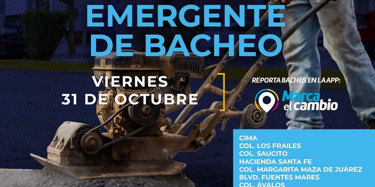 Ciudad de Chihuahua, Chih., El Gobierno Municipal, a través de la Dirección de Obras Públicas, bacheará este 31 de octubre, mediante el programa emergente, en calles de las colonias Cima, Los Frailes, Saucito, Hacienda Santa Fe, Margarita Maza de Juárez, Ávalos, Boulevard Fuentes Mares, y en las avenidas Heroico Colegio Militar y Tecnológico.