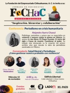 Para Ciudad Juárez, la actividad se realizará en formato virtual el 13 de noviembre a las 6:00 de la tarde. La programación incluye la conferencia Periodismo de investigación y posteriormente el conversatorio Contar juntos El poder del periodismo colaborativo, el cual busca reflexionar sobre la importancia de unir esfuerzos entre periodistas y medios para fortalecer la cobertura de temas de alto impacto social.