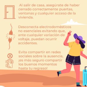 También se recomendó no compartir en redes sociales información sobre la ausencia del hogar, con el fin de reducir riesgos de robo, además de revisar previamente las condiciones del vehículo si se planea viajar por carretera, incluyendo frenos, llantas, aceite y parabrisas.
