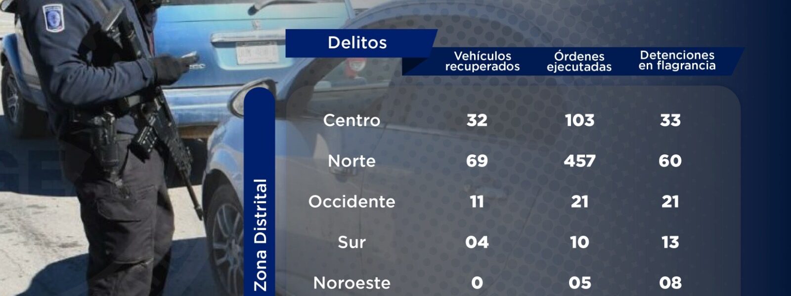 El informe fue integrado con información de la Dirección de Estadística Criminal, de la Agencia Estatal de Investigación y de las Fiscalías de Distrito Norte, Centro, Occidente, Noroeste y Sur. En cuanto a la recuperación de vehículos, 69 correspondieron a la Zona Norte, 32 a la Centro, 11 a la Occidente y cuatro a la Zona Sur.