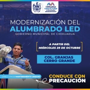 Ciudad de Chihuahua, Chih., El Gobierno Municipal, a través de Dirección de Mantenimiento Urbano informa que, a partir de hoy miércoles 29 de octubre, se iniciará con la modernización de luminarias LED en la colonia Granjas Cerro Grande, beneficiando con estos trabajos a miles de vecinos del sector.