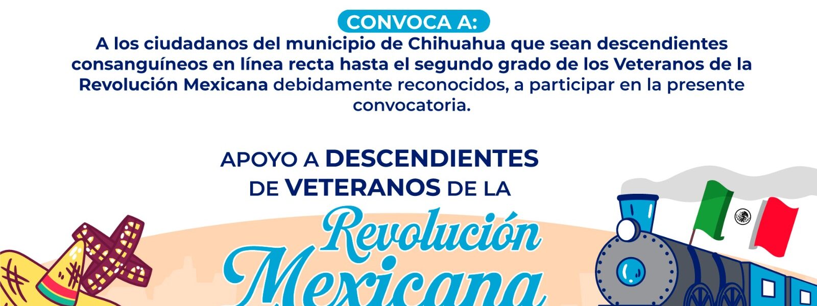 Chihuahua, Chih.- El Gobierno Municipal, a través de la Dirección de Desarrollo Humano y Educación, invita a ciudadanos de la ciudad que sean descendientes directos (hasta segundo grado) de veteranos reconocidos de la Revolución Mexicana, a participar en la convocatoria del programa “Apoyo a Descendientes de Veteranos de la Revolución Mexicana”.