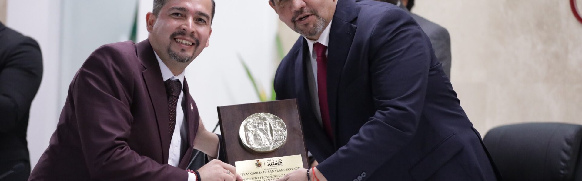 Ciudad Juárez, Chih., En una Sesión Solemne del Ayuntamiento de Juárez, el Presidente Municipal Cruz Pérez Cuéllar entregó la Presea Fray García de San Francisco edición 2025 al Instituto Tecnológico Nacional de México, campus Ciudad Juárez, en reconocimiento a su compromiso y aporte al desarrollo de la ciudad. El galardón fue recibido por el director del plantel Mario Macario Ruiz Grijalba, quien agradeció la distinción y destacó el honor que representa para toda la comunidad educativa.