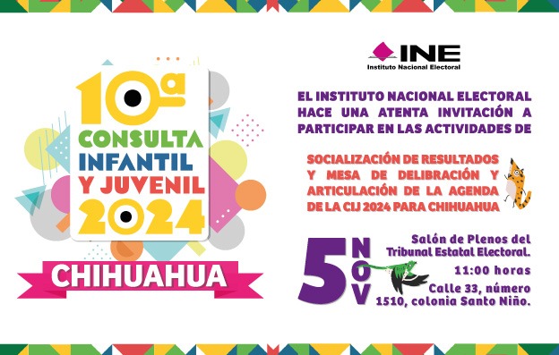 Chihuahua, Chih., El Instituto Nacional Electoral (INE) extendió una invitación a la ciudadanía para participar en el evento de Socialización y Mesa de Deliberación de Resultados de la Consulta Infantil y Juvenil 2024, un espacio destinado a analizar y compartir las opiniones expresadas por niñas, niños y adolescentes durante este importante ejercicio democrático.