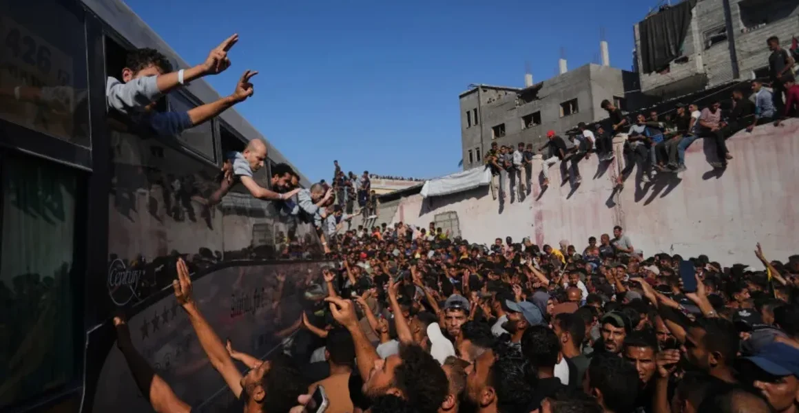 El convoy de liberación incluía alrededor de 40 autobuses que se desplazaron lentamente entre multitudes que recibían a los liberados en el complejo médico Nasser, en el sur de Gaza. Decenas de hombres armados dispararon al aire en señal de celebración y varios detenidos saludaban desde las ventanas o subidos a los techos de los autobuses mostrando banderas palestinas.