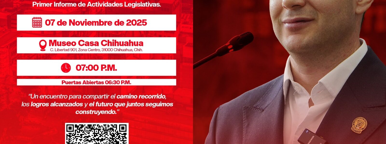 Durante el acto, el legislador dará a conocer los avances, gestiones e iniciativas impulsadas en su primer año de trabajo en el Congreso del Estado, destacando los resultados de un ejercicio legislativo enfocado en las necesidades de las y los chihuahuenses.