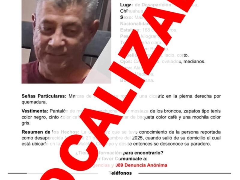 La Unidad de Investigación de Personas Ausentes y/o No Localizadas de la Fiscalía de Distrito Zona Centro (FDZC) localizó sano y salvo a Sergio Alberto A.H., de 58 años de edad, quien contaba con reporte de ausencia interpuesto en la ciudad de Chihuahua.