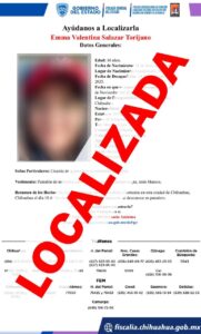 Fue localizada hoy en la colonia Infonavit en esta urbe en mención donde se corroboró su estado de salud, se descartó haber sido víctima de algún delito y refirió que su ausencia fue voluntaria.