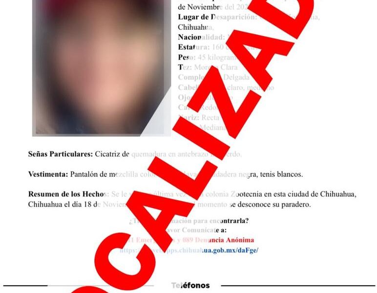 La menor de 16 años de edad fue reportada ante esta fiscalía luego de haber sido vista por última ocasión el 18 de noviembre en la colonia Zootecnia en la ciudad de Chihuahua.