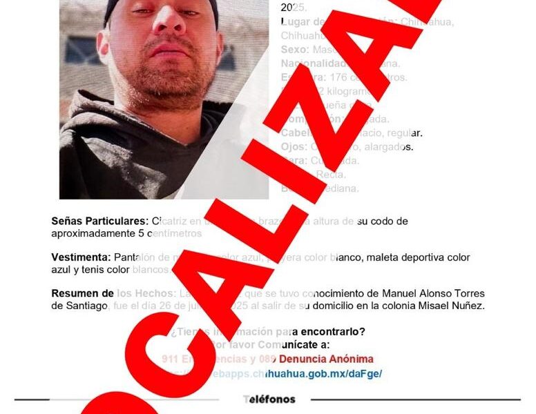 La Unidad de Investigación de Personas Ausentes y/o No Localizadas de la Fiscalía de Distrito Zona Centro (FDZC) localizó sano y salvo a Manuel Alonso T. S., de 38 años de edad, quien contaba con reporte de ausencia interpuesto en la ciudad de Chihuahua.