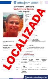 Ciudad Juárez, Chih., Elementos de la Fiscalía Especializada en Atención a Mujeres Víctimas del Delito por Razones de Género y a la Familia de la Zona Norte, localizaron sana y salva a Maribel F. C., de 46 años de edad, quien contaba con reporte de desaparición y/o ausencia, interpuesto el 20 de octubre de 2025, en Ciudad Juárez.