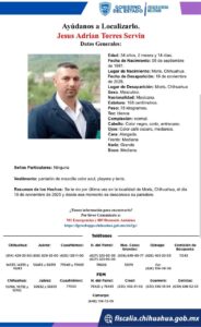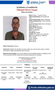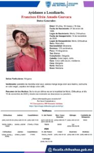 Moris, Chih., La Fiscalía de Distrito Zona Occidente, a través la Agencia Estatal de Investigación (AEI), realiza diversas acciones para la búsqueda y localización de tres masculinos con reporte de desaparición y/o ausencia, interpuesto el 19 de noviembre de 2025, en el municipio de Moris.