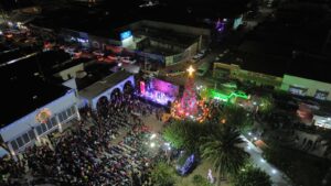 El evento comenzó con una cuenta regresiva que llenó de emoción a quienes asistieron. Al iluminarse el árbol, la plaza estalló en aplausos mientras la decoración navideña se encendía en conjunto. La noche cerró con la presentación del Grupo Los de la F, que puso a bailar a los presentes con su música en vivo.