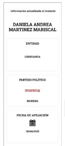 Esta afiliación, que aparece en el portal oficial del Instituto Nacional Electoral (INE), en la liga pública: https://deppp-partidos.ine.mx/afiliadosPartidos, tiene fecha del 28 de abril de 2025, es decir, cuatro meses después de que la lic. Martínez Mariscal asumiera de manera formal y activa su cargo dentro de nuestra estructura partidista.
