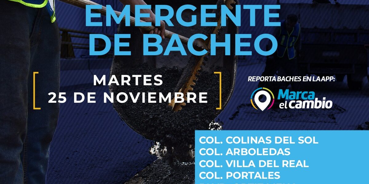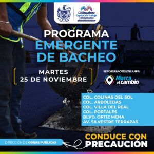 Chihuahua, Chih., El Gobierno Municipal informó que este martes 25 de noviembre se realizarán trabajos de bacheo en distintas vialidades mediante el programa emergente. Las labores se llevarán a cabo en calles de las colonias Colinas del Sol Arboledas Villa del Real y Portales además de intervenir el boulevard Ortiz Mena y la avenida Silvestre Terrazas. Se pidió a los conductores manejar con precaución debido a la presencia de varias cuadrillas desde temprana hora.