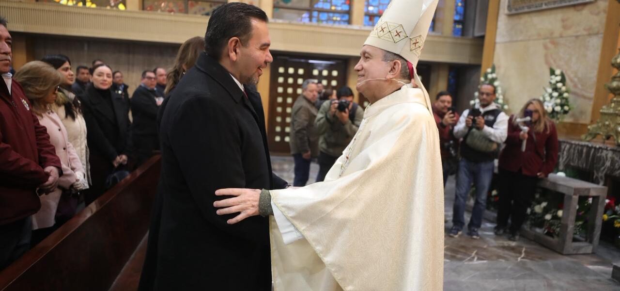 Ciudad Juárez, Chih., El Presidente Municipal de Ciudad Juárez, Cruz Pérez Cuéllar, acompañado de su esposa Rubí Enríquez, asistió a la misa celebrada en la Catedral de Nuestra Señora de Guadalupe con motivo del 366 aniversario de la fundación de la ciudad. Durante la ceremonia, el alcalde destacó la importancia de conmemorar este evento anual y reconoció la labor de los juarenses.
