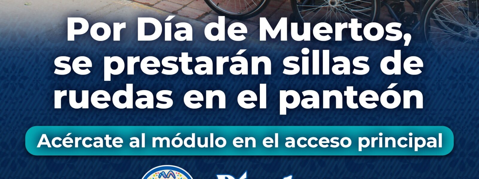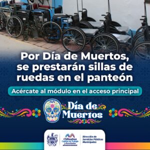 Ciudad de Chihuahua, Chih., El Gobierno Municipal, a través de la Dirección de Servicios Públicos Municipales, informa a la población que se contará con el servicio de préstamo de sillas de ruedas en las instalaciones del Panteón Municipal 1, a partir del viernes 31 de octubre al domingo 2 de noviembre.