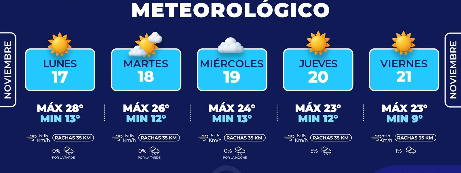De acuerdo con el Servicio Meteorológico Nacional este lunes 17 de noviembre se prevé un día soleado, con una máxima de 28°C y mínima de 13°C; asimismo, para este martes 18, prevén cielos parcialmente nublados, con máximas de 26°C, mínimas de 12°C y sin probabilidad de lluvias.