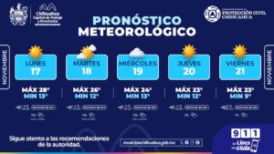 Ciudad de Chihuahua, Chih., El Gobierno Municipal de Chihuahua, a través de la Coordinación Municipal de Protección Civil, informa que durante esta semana se prevén mañanas frescas, así como tardes un poco más calurosas, por lo que exhortan a no bajar la guardia y cuidarse de los cambios de temperatura para evitar enfermedades.